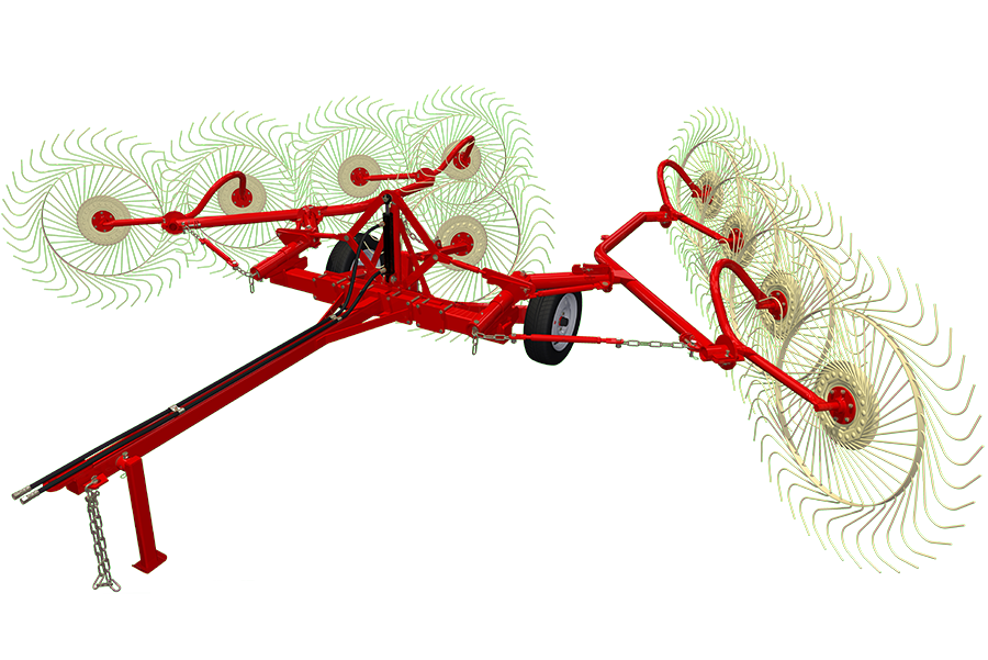 - Наличие дополнительного среднего колеса в основной комплектации граблей. Данное рабочее колесо позволяет ворошить скошенную массу по центру граблей, в месте укладки валка.